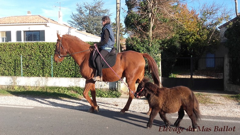 Manipulé régulièrement il se laisse facilement attraper au pré, suis en longe et donne les pieds. Il monte facilement dans le van, a déjà fait des promenades en bord de route avec voitures, klaxons, vélos, ….